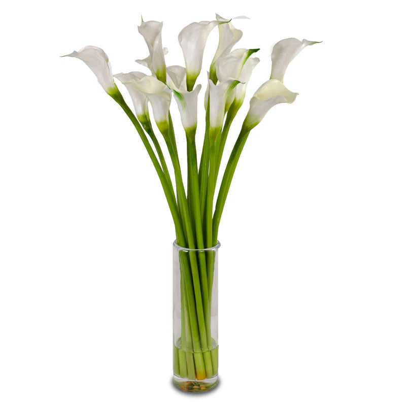 Discover the timeless allure of white calla lilies, a specialty flower renowned for its elegance and grace. These pristine blooms make a striking statement in any home decor arrangement, exuding sophistication and refinement. Perfect for adding a touch of luxury to your living space, their sleek, trumpet-shaped blossoms captivate with their minimalist beauty. Elevate your interior design with the understated charm of white calla lilies, creating an ambiance of effortless sophistication and timeless style.